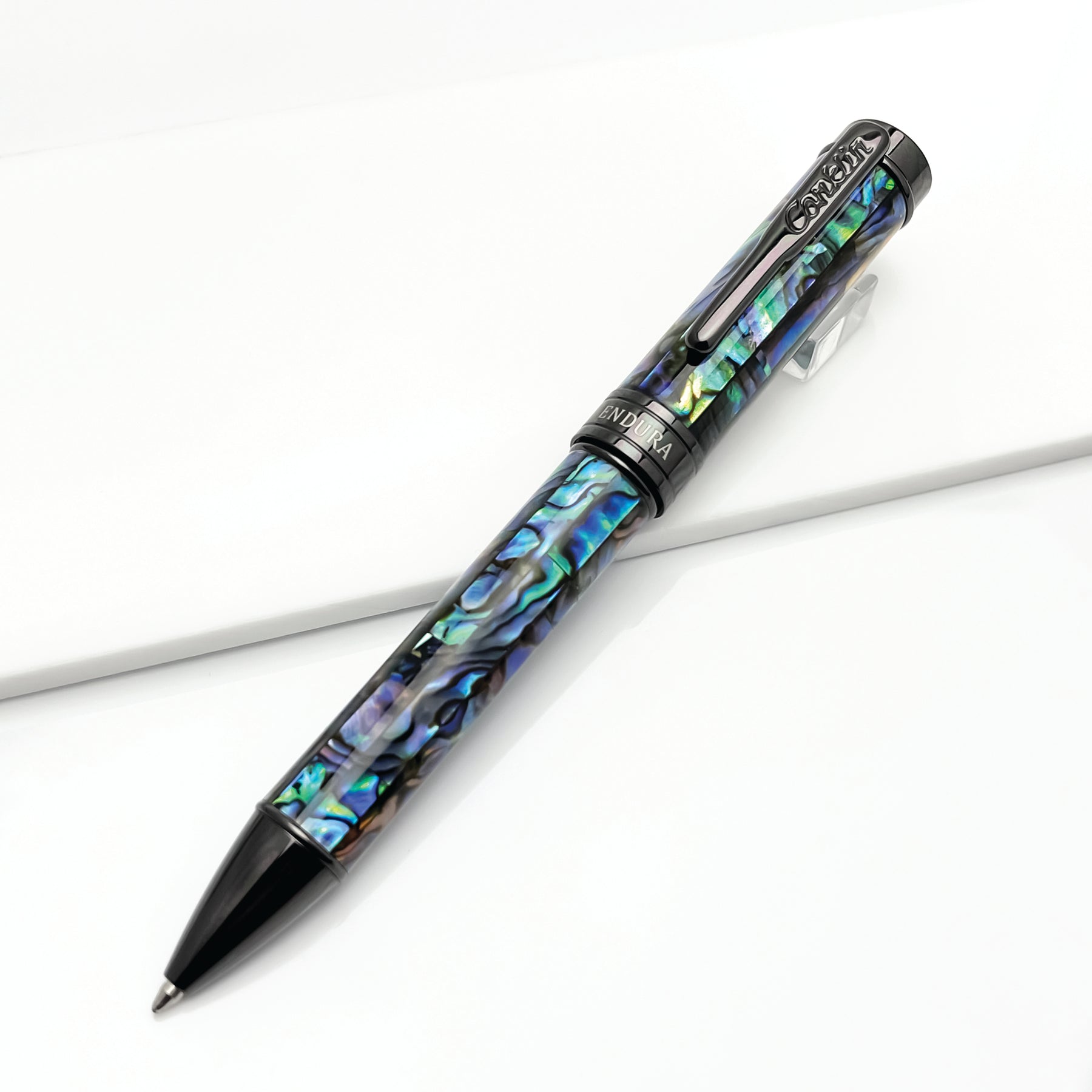 Hand-turned and hand-polished, the barrel brilliantly reflects shimmering light off of its surface, enhancing the stunning colors of the Abalone shell. Lustrous Gunmetal plating adorns the clip, band, and trim, enhancing the elegance of each Endura pen.