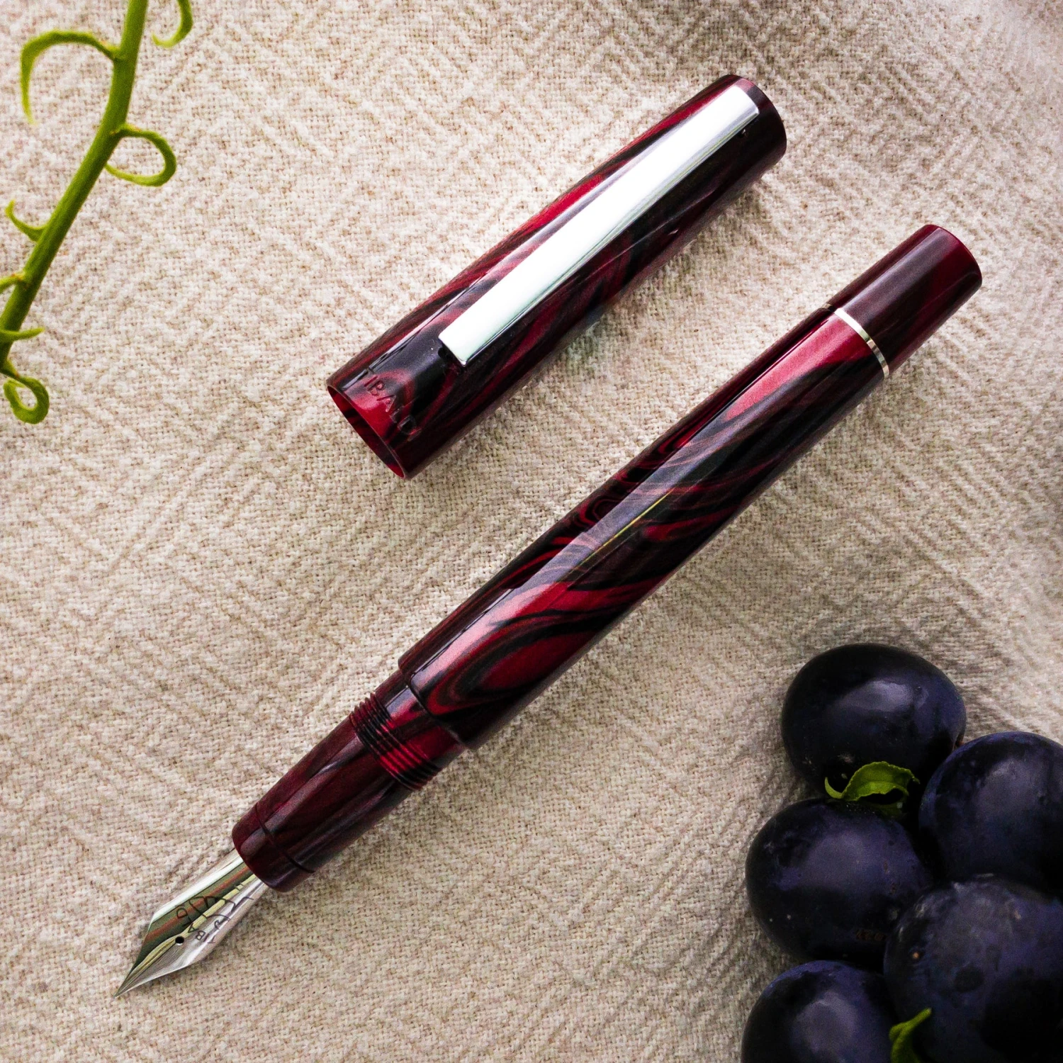 The Pen is handcrafted from Mauve and black swirled resin. The Fountain pen features an ebonite feed and a stainless steel nib.Β