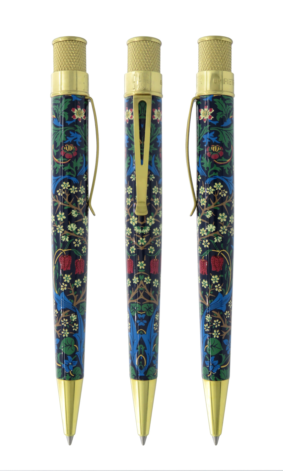 The “Blackthorn” pattern was designed by textile artist William Morris during the Arts and Crafts Movement of the 19th century. Several colors have been printed around the Tornado’s stainless-steel barrel that’s finished with a gloss varnish and polished brass accents.